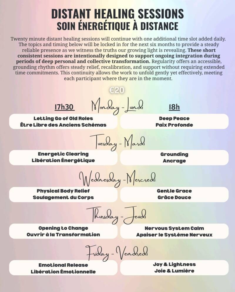 Ces séances très accessibles permettent une intégration continue durant des périodes de transformation personnelle et collective profondes. Elles apportent un soulagement, offrent une recalibration et permettent un soutien constants, sans engagement prolongé.